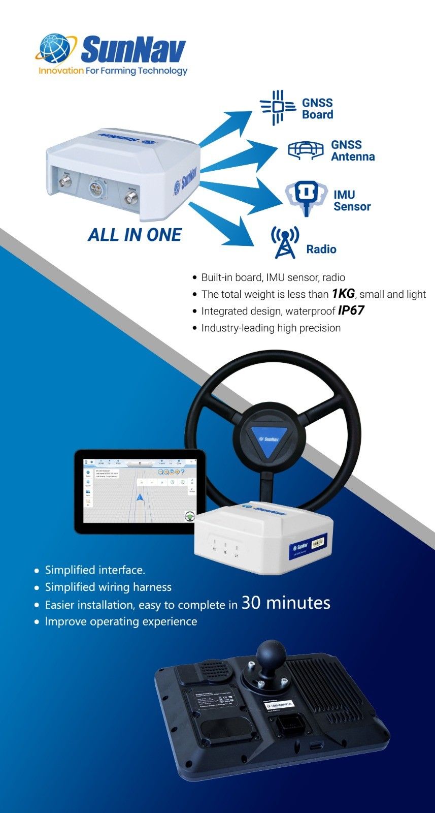 Le système de direction automatique SUNNAV peut vous offrir un guidage automatique de haute performance pour tous types de véhicules ( tracteurs,pulvérisateurs, moissonneuses-batteuses,.. ). Il peut fournir une précision jusqu'à 2,5 cm.